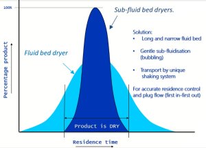 In conventional fluid bed dryers, product layer thickness is typically limited to 10–15 cm, as thicker layers lead to excessive axial mixing and a broad residence time distribution. Sub-fluid bed drying overcomes this limitation by operating with significantly thicker product layers, up to 60 cm.