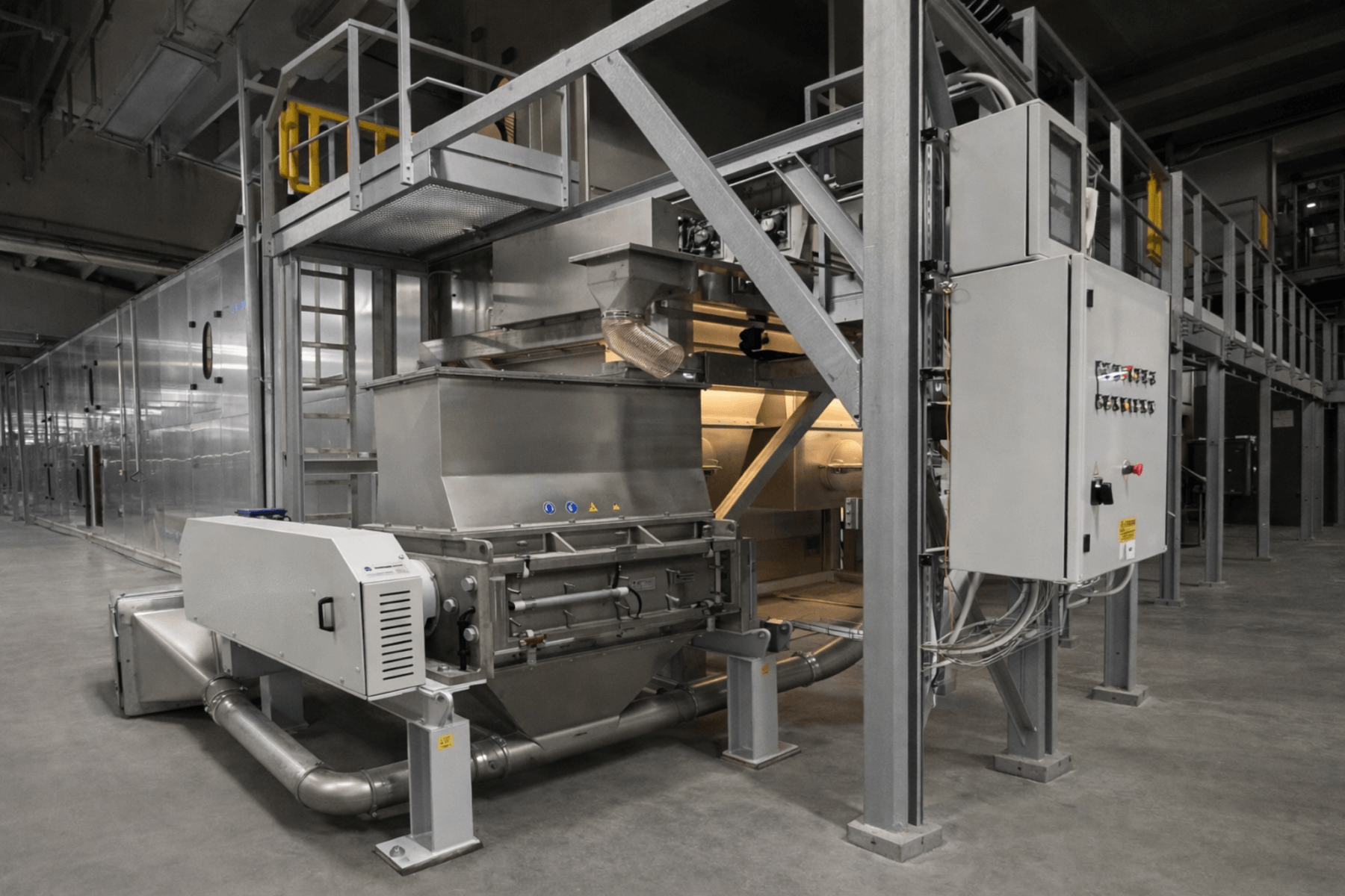 Im letzten Abschnitt senkt eine Kühlzone die Produkttemperatur auf unter 25 °C, wodurch das Feuchtigkeitsprofil fixiert und die Handhabung erleichtert wird. Die getrockneten Nudeln gelangen in eine Mühle oder einen Brecher, die sie in eine einheitliche Granulat- oder Pulverform umwandeln, damit sie gemischt, verpackt oder weiter veredelt werden können. Geschlossene Transfersysteme schützen vor Wiederbefeuchtung und Staubemissionen und erfüllen die ATEX- und OSHA-Normen zur Staubkontrolle.